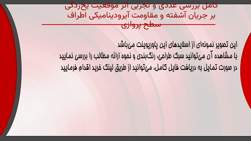 پاورپوینت کامل بررسی عددی و تجربی اثر موقعیت یخزدگی بر جریان آشفته و مقاومت آیرودینامیکی اطراف سطح پروازی