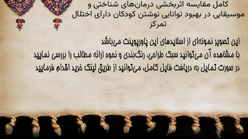 پاورپوینت کامل مقایسه اثربخشی درمانهای شناختی و موسیقایی در بهبود توانایی نوشتن کودکان دارای اختلال تمرکز