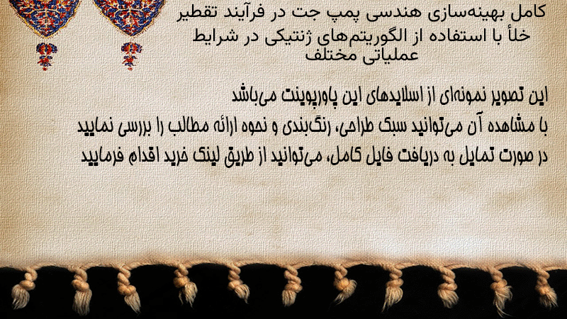 پاورپوینت کامل بهینهسازی هندسی پمپ جت در فرآیند تقطیر خلأ با استفاده از الگوریتمهای ژنتیکی در شرایط عملیاتی مختلف