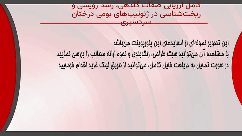 پاورپوینت کامل ارزیابی صفات گلدهی، رشد رویشی و ریختشناسی در ژنوتیپهای بومی درختان سردسیری
