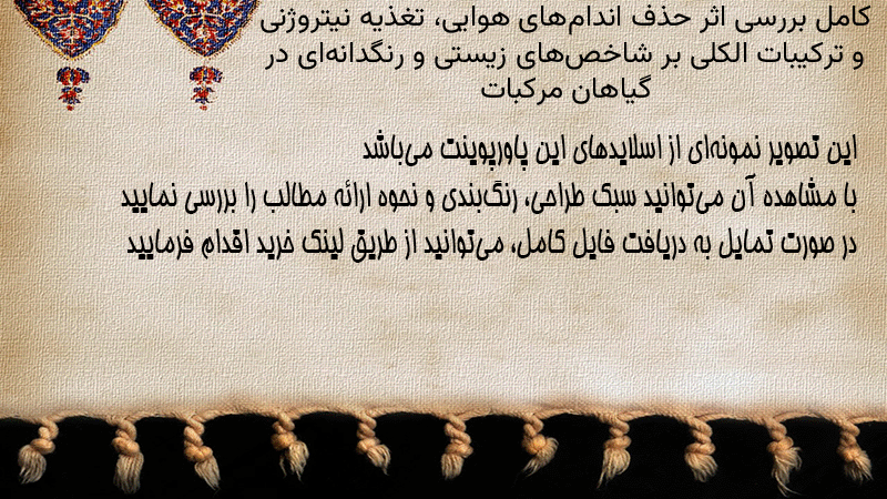 پاورپوینت کامل بررسی اثر حذف اندامهای هوایی، تغذیه نیتروژنی و ترکیبات الکلی بر شاخصهای زیستی و رنگدانهای در گیاهان مرکبات