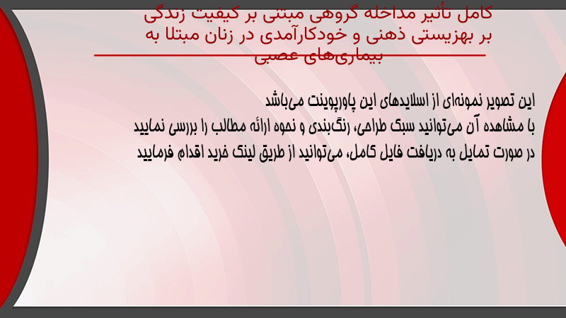 پاورپوینت کامل تأثیر مداخله گروهی مبتنی بر کیفیت زندگی بر بهزیستی ذهنی و خودکارآمدی در زنان مبتلا به بیماریهای عصبی