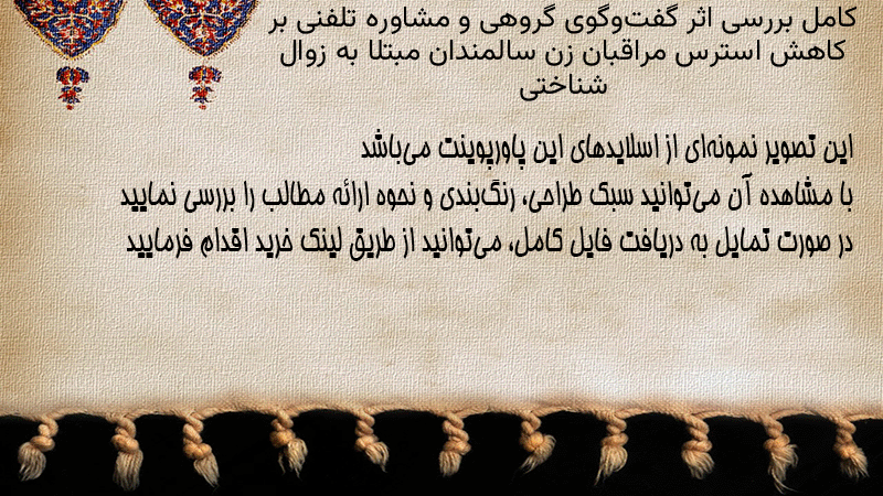 پاورپوینت کامل بررسی اثر گفتوگوی گروهی و مشاوره تلفنی بر کاهش استرس مراقبان زن سالمندان مبتلا به زوال شناختی