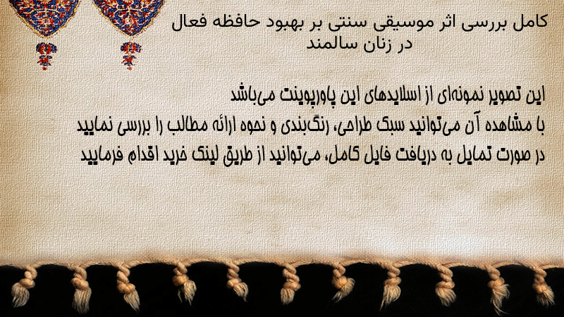 پاورپوینت کامل بررسی اثر موسیقی سنتی بر بهبود حافظه فعال در زنان سالمند