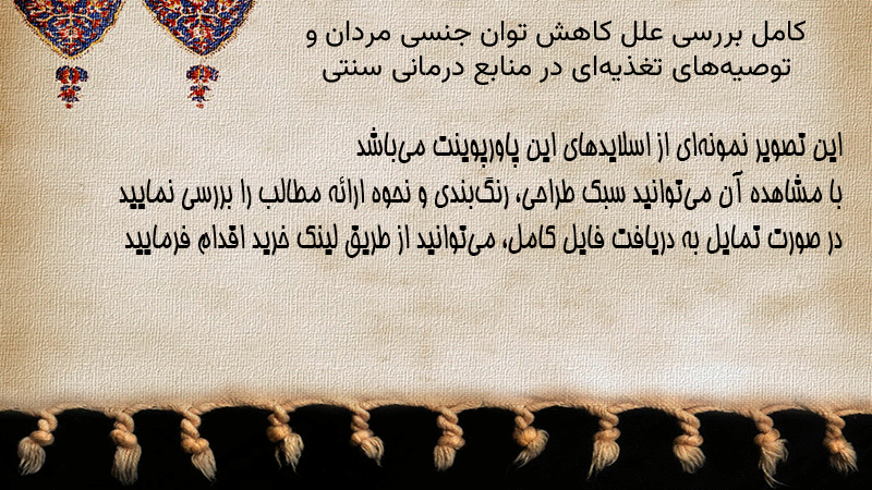 پاورپوینت کامل بررسی علل کاهش توان جنسی مردان و توصیههای تغذیهای در منابع درمانی سنتی
