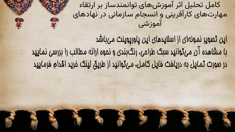 پاورپوینت کامل تحلیل اثر آموزشهای توانمندساز بر ارتقاء مهارتهای کارآفرینی و انسجام سازمانی در نهادهای آموزشی