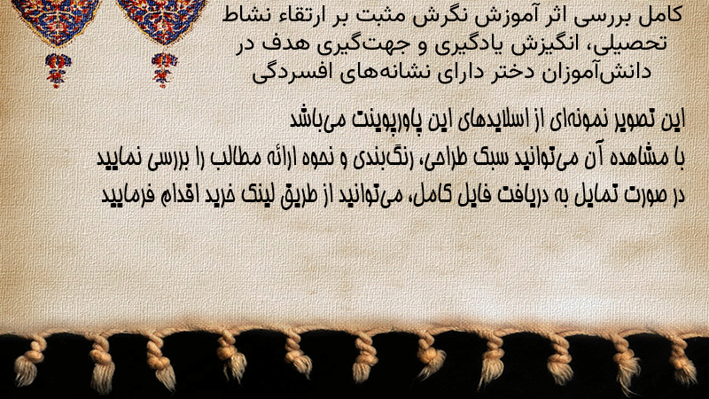 پاورپوینت کامل بررسی اثر آموزش نگرش مثبت بر ارتقاء نشاط تحصیلی، انگیزش یادگیری و جهتگیری هدف در دانشآموزان دختر دارای نشانههای افسردگی