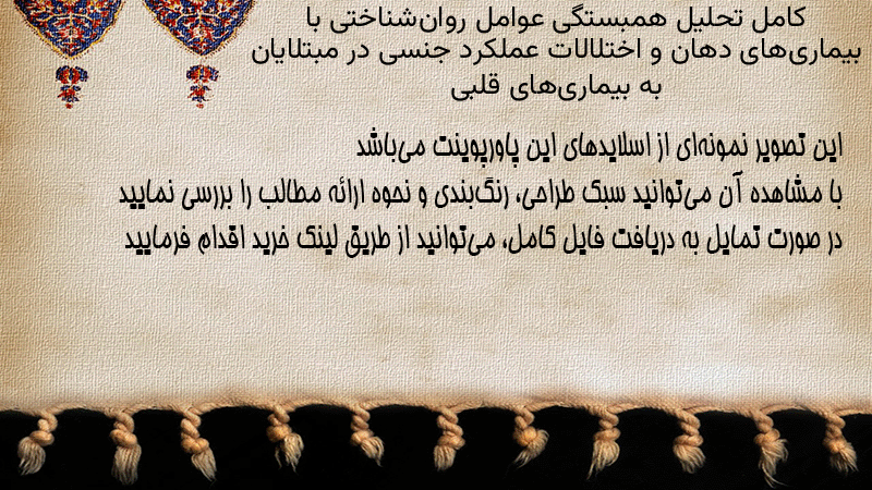 پاورپوینت کامل تحلیل همبستگی عوامل روانشناختی با بیماریهای دهان و اختلالات عملکرد جنسی در مبتلایان به بیماریهای قلبی