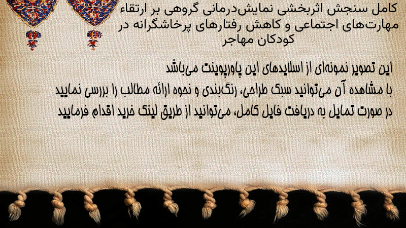 پاورپوینت کامل سنجش اثربخشی نمایشدرمانی گروهی بر ارتقاء مهارتهای اجتماعی و کاهش رفتارهای پرخاشگرانه در کودکان مهاجر