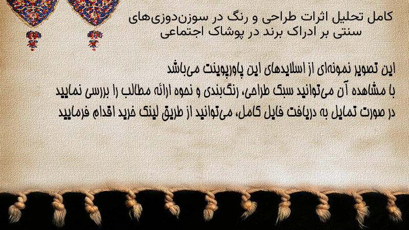 پاورپوینت کامل تحلیل اثرات طراحی و رنگ در سوزندوزیهای سنتی بر ادراک برند در پوشاک اجتماعی