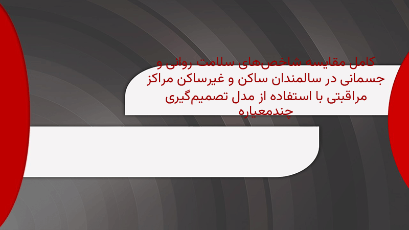 پاورپوینت کامل مقایسه شاخصهای سلامت روانی و جسمانی در سالمندان ساکن و غیرساکن مراکز مراقبتی با استفاده از مدل تصمیمگیری چندمعیاره