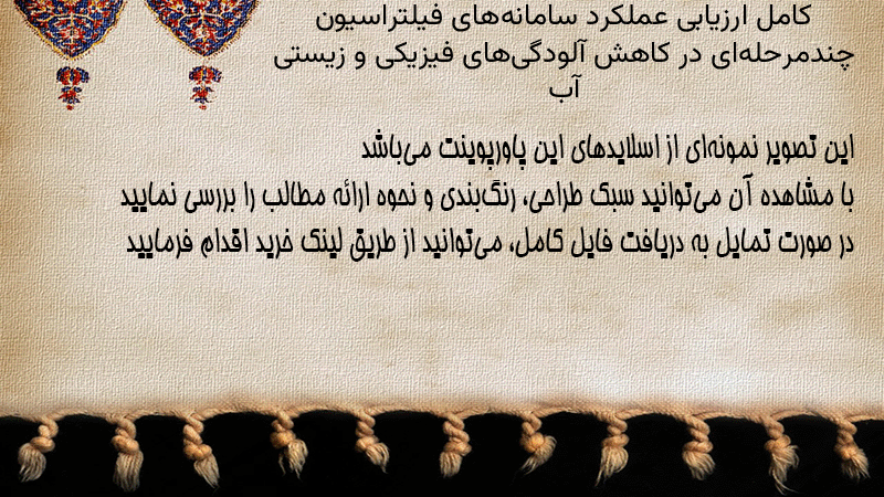 پاورپوینت کامل ارزیابی عملکرد سامانههای فیلتراسیون چندمرحلهای در کاهش آلودگیهای فیزیکی و زیستی آب
