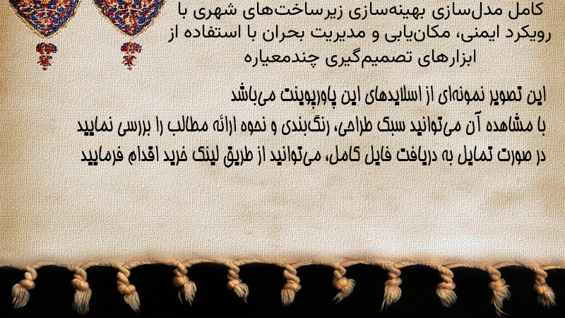 پاورپوینت کامل مدلسازی بهینهسازی زیرساختهای شهری با رویکرد ایمنی، مکانیابی و مدیریت بحران با استفاده از ابزارهای تصمیمگیری چندمعیاره