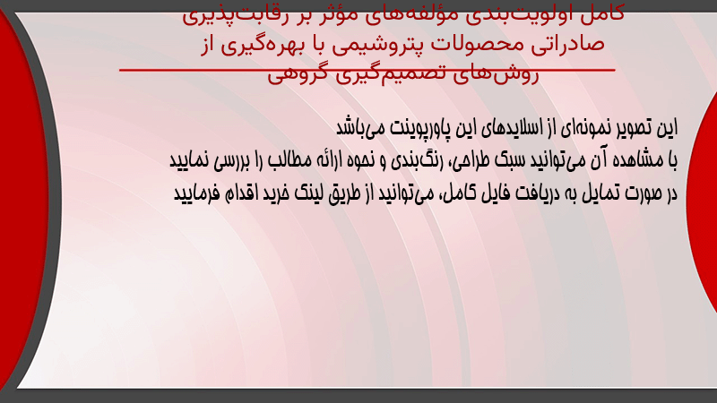 پاورپوینت کامل اولویتبندی مؤلفههای مؤثر بر رقابتپذیری صادراتی محصولات پتروشیمی با بهرهگیری از روشهای تصمیمگیری گروهی
