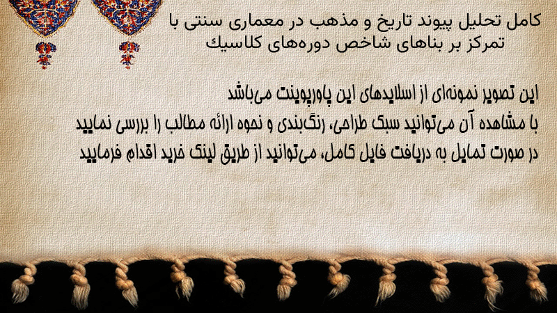 پاورپوینت کامل تحلیل پیوند تاریخ و مذهب در معماری سنتی با تمرکز بر بناهای شاخص دورههای کلاسیک