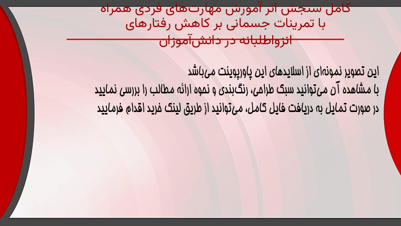 پاورپوینت کامل سنجش اثر آموزش مهارتهای فردی همراه با تمرینات جسمانی بر کاهش رفتارهای انزواطلبانه در دانشآموزان