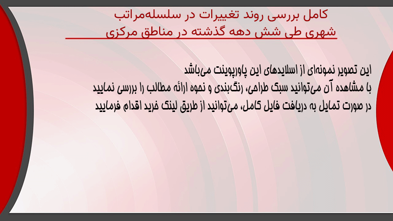پاورپوینت کامل بررسی روند تغییرات در سلسلهمراتب شهری طی شش دهه گذشته در مناطق مرکزی