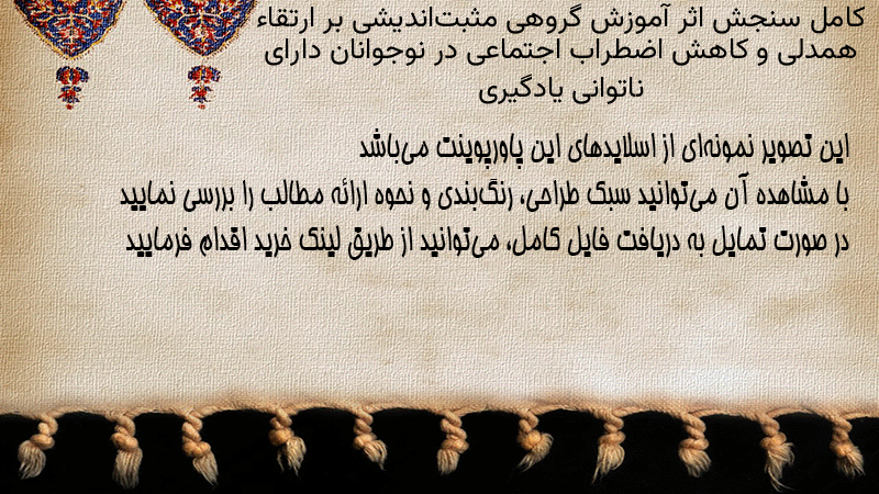 پاورپوینت کامل سنجش اثر آموزش گروهی مثبتاندیشی بر ارتقاء همدلی و کاهش اضطراب اجتماعی در نوجوانان دارای ناتوانی یادگیری