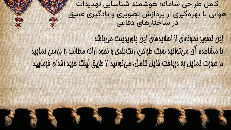پاورپوینت کامل طراحی سامانه هوشمند شناسایی تهدیدات هوایی با بهرهگیری از پردازش تصویری و یادگیری عمیق در ساختارهای دفاعی