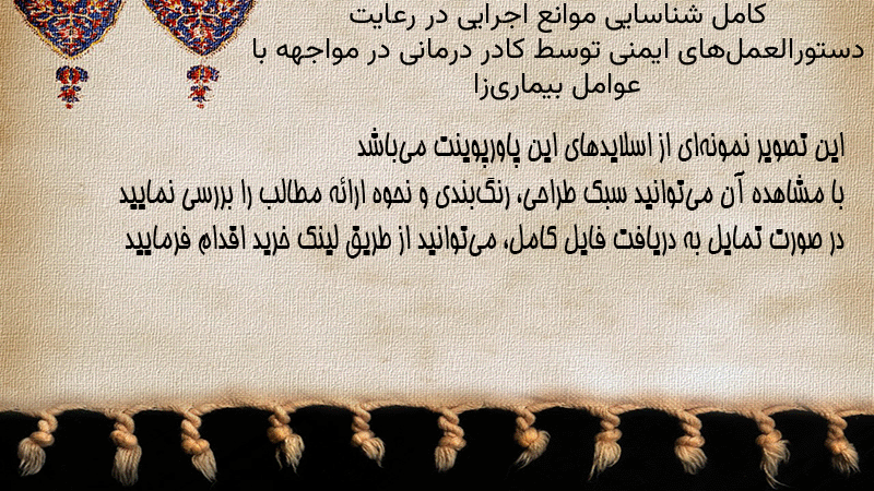 پاورپوینت کامل شناسایی موانع اجرایی در رعایت دستورالعملهای ایمنی توسط کادر درمانی در مواجهه با عوامل بیماریزا