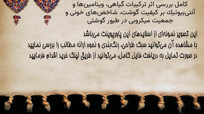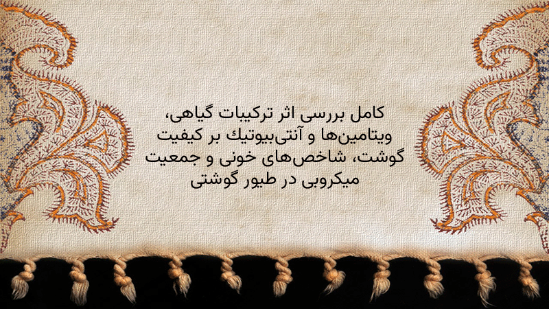 پاورپوینت کامل بررسی اثر ترکیبات گیاهی، ویتامینها و آنتیبیوتیک بر کیفیت گوشت، شاخصهای خونی و جمعیت میکروبی در طیور گوشتی