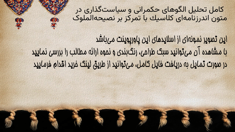 پاورپوینت کامل تحلیل الگوهای حکمرانی و سیاستگذاری در متون اندرزنامهای کلاسیک با تمرکز بر نصیحهالملوک