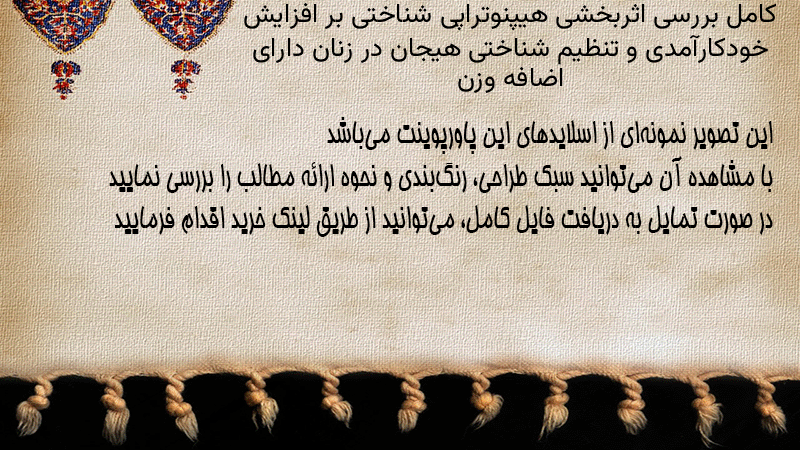 پاورپوینت کامل بررسی اثربخشی هیپنوتراپی شناختی بر افزایش خودکارآمدی و تنظیم شناختی هیجان در زنان دارای اضافه وزن