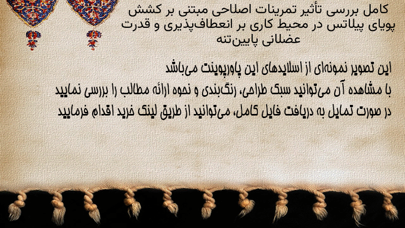 پاورپوینت کامل بررسی تأثیر تمرینات اصلاحی مبتنی بر کشش پویای پیلاتس در محیط کاری بر انعطافپذیری و قدرت عضلانی پایینتنه