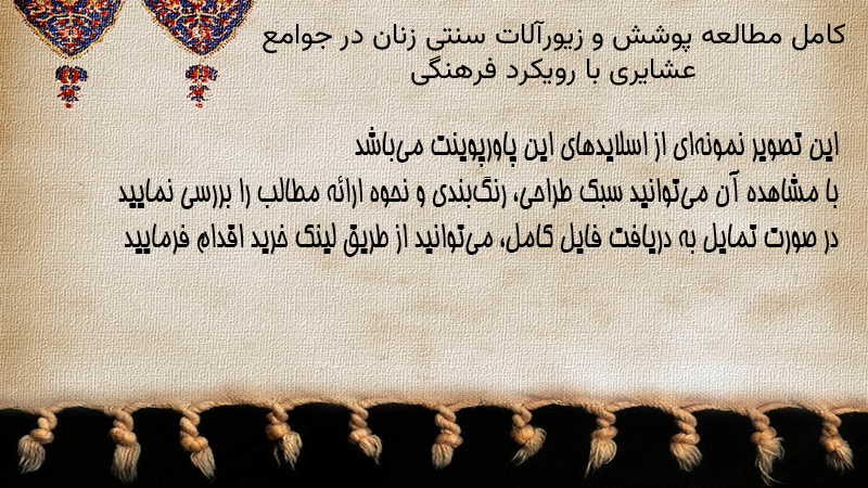 پاورپوینت کامل مطالعه پوشش و زیورآلات سنتی زنان در جوامع عشایری با رویکرد فرهنگی