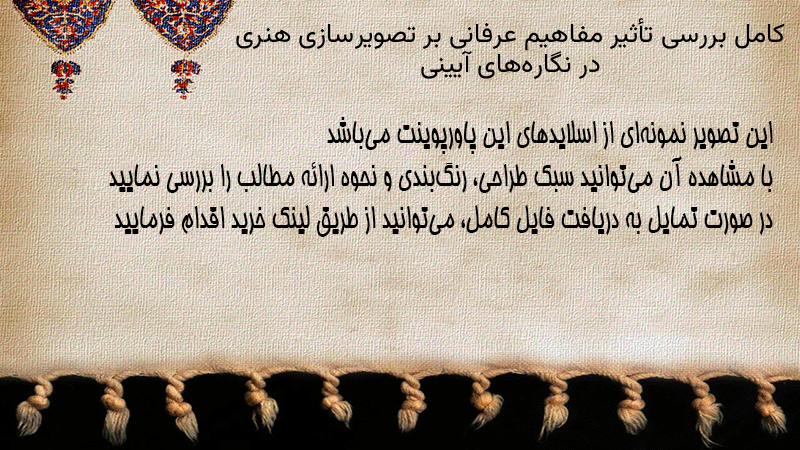 پاورپوینت کامل بررسی تأثیر مفاهیم عرفانی بر تصویرسازی هنری در نگارههای آیینی