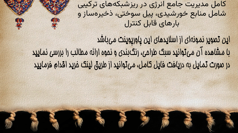 پاورپوینت کامل مدیریت جامع انرژی در ریزشبکههای ترکیبی شامل منابع خورشیدی، پیل سوختی، ذخیرهساز و بارهای قابل کنترل
